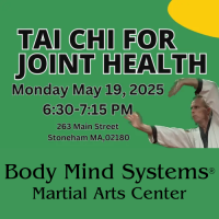 Come learn Tai Chi and QiGong at Human Harmonies, at Body Mind Systems Stoneham. This event is an introductory lesson to Tai Chi with a focus on movements and exercises that promote joint health. Tai Chi and QiGong are martial arts forms known for promoting energy, good health, flexibility and mindfulness. Also useful for stress release and relaxation.